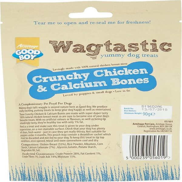 Show your dog how much you care with a treat that goes beyond taste. The Goodboy Wagtastic Chicken & Calcium Bones combine nutrition, fun, and function—all in one bite.