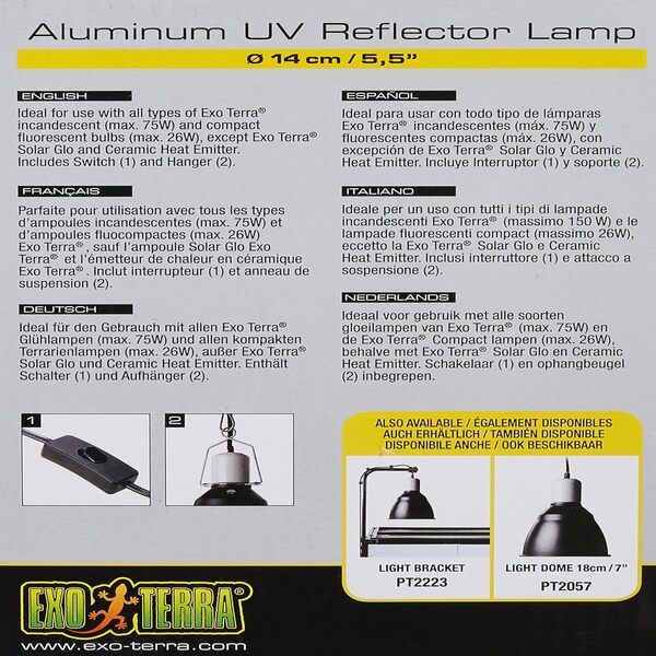 Exo Terra UV – Reflector Lamp – 14cm / 18cm boosts UVB and UVA light output in reptile terrariums. It helps reptiles get the proper exposure to support bone strength and healthy development. The lamp reflects and focuses light directly onto the basking area, enhancing vitamin D3 production and calcium absorption.