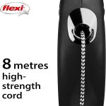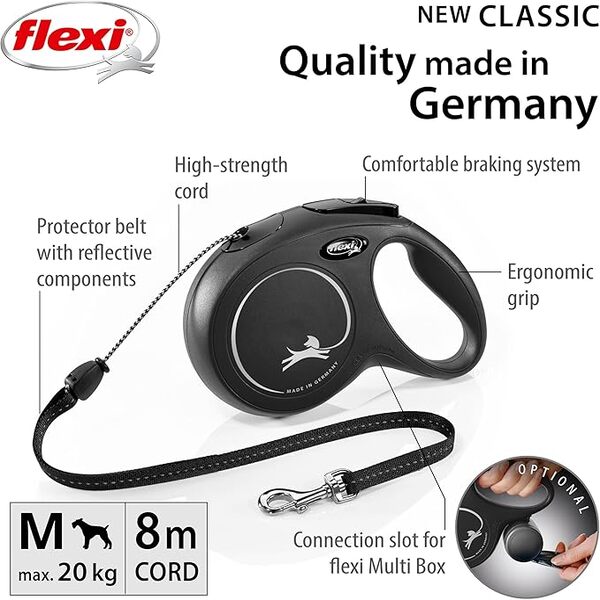 Enhance your daily walks with the Flexi New Classic Cord 8m Black Leash, ideal for medium-sized dogs up to 20kg. This high-quality retractable dog leash features a durable 8-meter cord that gives your pet freedom to explore while keeping you in full control. With its smooth one-hand braking and locking system, you can quickly react to any situation. The ergonomic grip handle ensures comfort during long strolls, offering a secure and effortless walking experience.