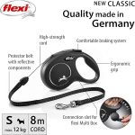 Crafted in Germany with premium materials, the Flexi New Classic Black Leash combines durability, flexibility, and safety. Its sleek black design adds a modern and stylish touch, perfect for daily use in both urban and outdoor settings. Whether you’re training, walking, or adventuring, this retractable dog leash is trusted by pet owners worldwide for its reliable performance and long-lasting quality.