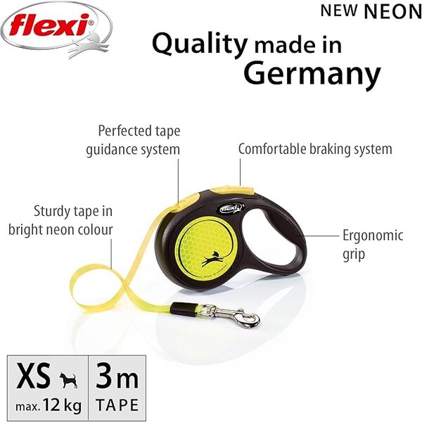Crafted in Germany with premium materials, this XS-sized leash offers a smooth one-hand braking system and an ergonomic grip for maximum comfort and handling. Whether you’re out on a daytime stroll or an evening walk, the Flexi Neon Tape leash ensures both style and security. Ideal for small dogs and cats, it’s the perfect blend of durability, comfort, and safety.