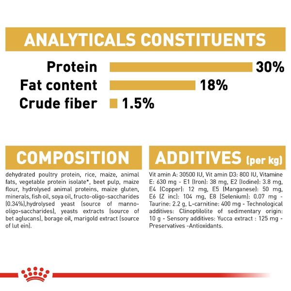 To improve digestion, the formula includes highly digestible L.I.P. proteins and prebiotics (FOS), promoting gut balance and healthy stools. The uniquely shaped kibble fits the Cavalier’s jaw, making chewing easier while reducing tartar buildup with added calcium chelators.